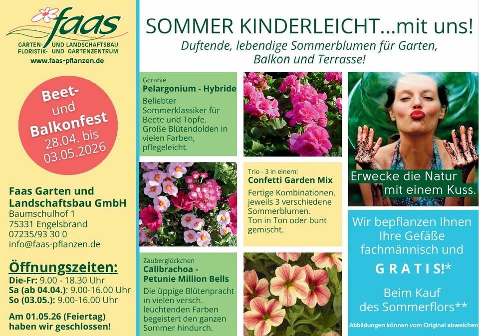 Wer Balkonkästen, Kübel und Beete rechtzeitig für die warme Jahreszeit vorbereiten möchte, kann sich Ende April in Engelsbrand inspirieren lassen: Die Faas Garten und Landschaftsbau GmbH veranstaltet vom 28. April bis 3. Mai 2026 ihr erfolgreiches Beet- und Balkonfest. Im Mittelpunkt steht eine große Auswahl an Sommerblumen für Garten, Balkon und Terrasse – passend für sonnige Momente.