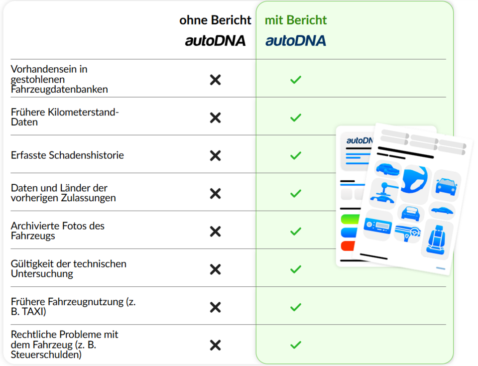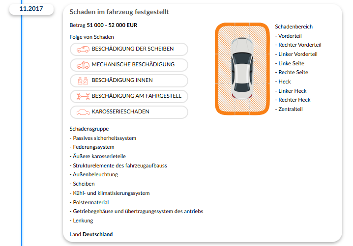 U. a. Schäden/Reparaturen, Serviceeinträge, Kilometerstand, Vorhalter, Diebstahlstatus, Archivfotos sowie Hinweise auf Flotten-/Taxi-Nutzung. Das ermöglicht eine realistische Zustandsbewertung und die Vermeidung von Fahrzeugen mit versteckten Schäden.