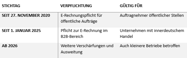 Viele Unternehmer unterschätzen den zeitlichen Druck, den die gesetzliche Umsetzung mit sich bringt. Folgende Tabelle bietet eine Übersicht: