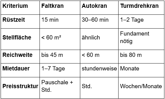 Vor der Entscheidung lohnt der Blick auf andere Krantypen. Autokräne glänzen bei Einzelhüben, Turmdrehkrane bei Monatsbaustellen. Der Faltkran besetzt das Feld dazwischen und kombiniert eine kurze Rüstzeit mit hoher Reichweite: