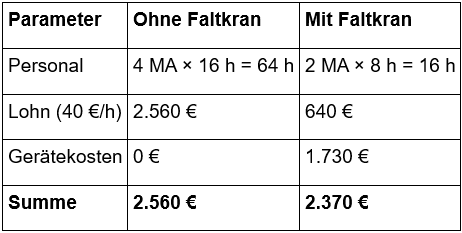 Gerade für Einsteiger zählt ein greifbarer Kostenvergleich. Die folgende Musterrechnung nutzt typische Preise in Deutschland für den Verleih solcher Faltkrane (450 Euro Grundpauschale + 160 Euro/h) und verdeutlicht das Einsparpotenzial: