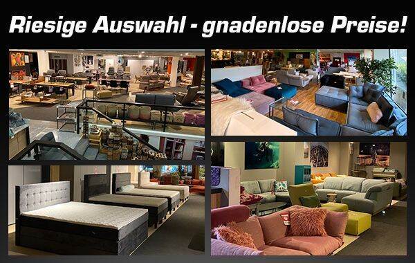 Egal ob Messestücke, Aussteller, Rückläufer, Einzel-, 1B- oder Mustermöbel - eine gigantische Menge an neuen Massivholztischen und (Boxspring-) Betten, Sofalandschaften mit und ohne Fuktion, präsentiert sich ebenfalls eine Vielfalt von Stühlen, Kleiderschränken, Lampen und Accessoires. Die bisherige Outletware ist nochmals drastisch reduziert worden - eine Kampfansage an alle Schummelrabatte, welche andernortes oft versprochen werden.