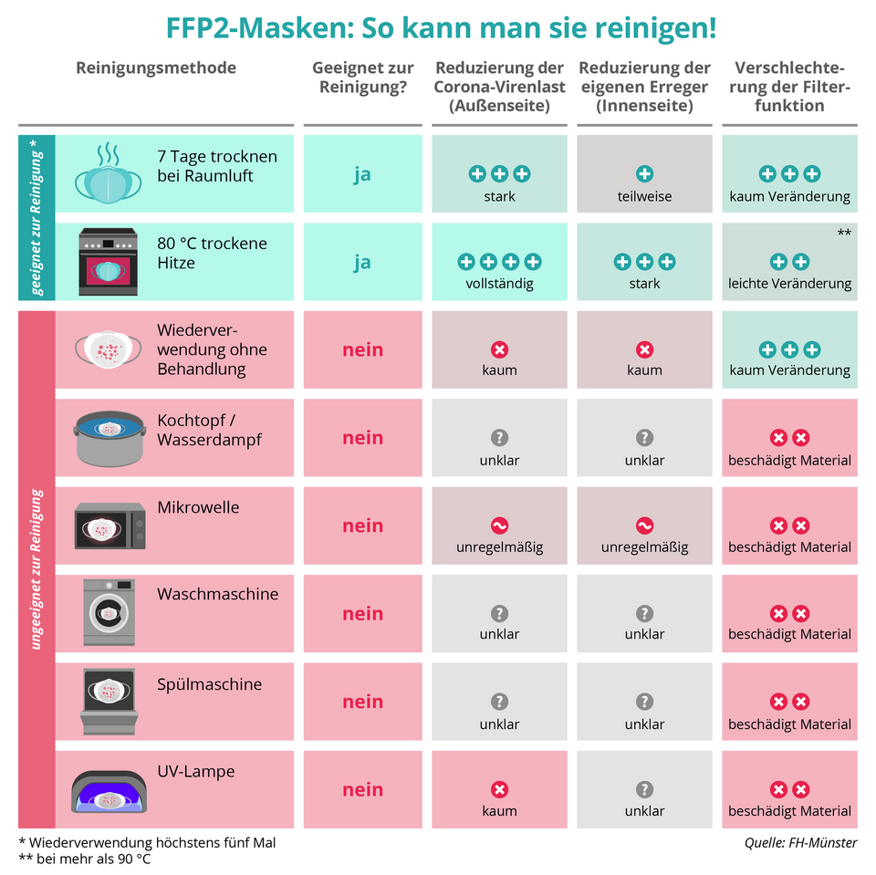Von den teilweise kursierenden Methoden der Reinigung durch den Kochtopf oder mit Wasserdampf, in diversen Küchengeräten wie der Mikrowelle, Waschmaschine oder Spülmaschine oder auch mit einer UV-Lampe ist abzuraten. Diese beschädigen allesamt das Material der FFP2-Masken, sodass die Schutzwirkung nicht mehr gegeben ist. Bei einer Desinfektion in der Mikrowelle besteht zudem Brandgefahr, hierdurch kam es schon zu Anfang der Pandemie öfter zu Wohnungsbränden.