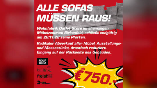 Durch Umstrukturierung der Immobilie des ehemaligen Möbelzentrums Birkenfeld, hat sich die Wohnfabrik Pforzheim entschlossen, einen final drastischen, letzten Räumungsverkauf zu vollziehen.