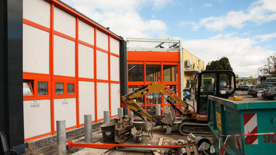 {element}In dieser Zeit wurden nicht nur der Teppichboden neu verlegt, die Elektroverteilung neu installiert, eine neue Beleuchtung eingebaut und der Eingangsbereich neu gestaltet, sondern auch eine komplett neue Außenfassade errichtet – von einer Betonfassade auf eine "mikrolinierte Metallfassade", wie es Timo Gsell beschreibt.Des weiteren wurden auch neue Werbe- und Schriftmittel außen angebracht.