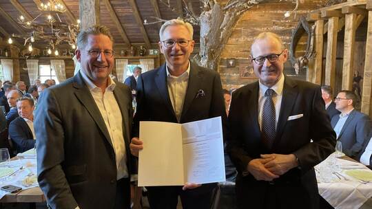 Matthias Hümpfner, Vorstandschef der Volksbank pur (von links) mit Bankvorstand René Baum und dem Aufsichtsratsvorsitzenden Roman Glaser, der Baum die Ehrenurkunde des Baden-Württembergischen Genossenschaftsverbands überreichte.