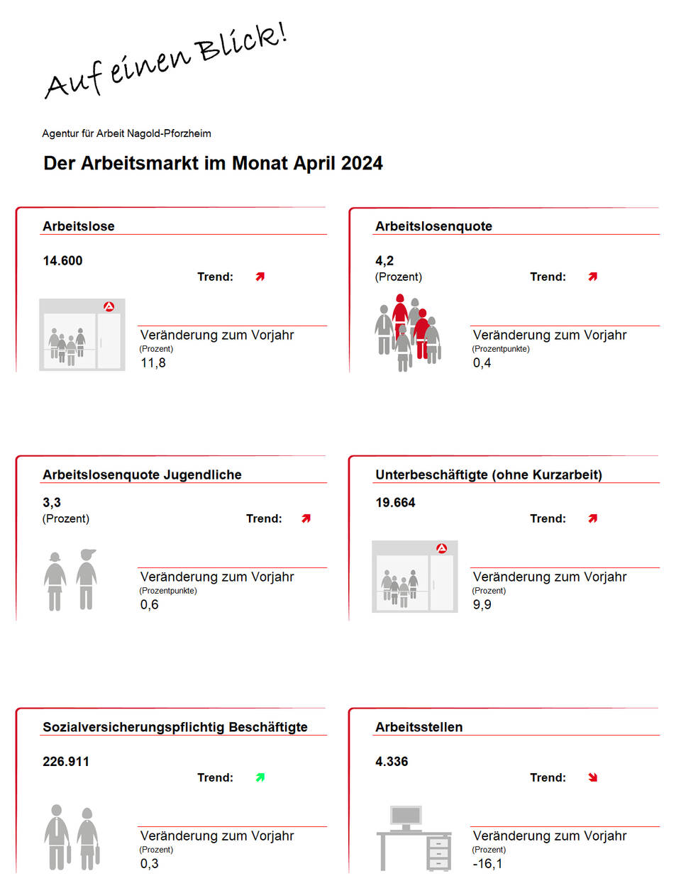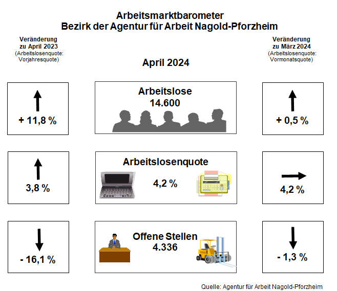 Pforzheim/Enzkreis/Kreis Calw. Die schwache Konjunktur macht sich zunehmend am regionalen Arbeitsmarkt bemerkbar. Die Zahl der Arbeitslosen im Bezirk der Agentur für Arbeit Nagold-Pforzheim ist von März auf April um 70 oder 0,5 Prozent auf 14.600 gestiegen. Wesentlich deutlicher war der Anstieg im Vergleich zum Vorjahr: Gegenüber April 2023 ist die Arbeitslosigkeit im Nordschwarzwald um 1.537 Menschen oder 11,8 Prozent gestiegen.