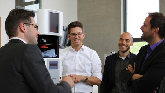 Gesucht werden vor allem optimale Lösungen für die Zufahrten, LKW-Anlieferungen und für die Parkplätze der Mitarbeiter bei Koch und bei Kunzmann. „Platz und gute Leute“, bringt es Helmut Kunzmann auf den Punkt – denn aufgrund der geringen Stückzahlen werde das meiste manuell gefertigt. Der Bedarf an hochqualifizierten Fachkräften ist überall groß – das erfuhren der Landrat und Heimsheims Bürgermeister Jürgen Troll beim Großhandelsunternehmen Chefsculinar Süd ebenso wie bei Schultheiss Rapidshape im Heimsheimer Industriegebiet an der Autobahn. „Vor allem in den Bereichen IT, Mechatronik, Maschinenbau und Elektronik fehlen Leute,“ berichtete Senior-Chef Georg Schultheiss. Man stehe in einem knallharten Wettbewerb mit Weltfirmen wie Porsche, Bosch oder Bertrandt – „da haben wir als unbekannter Mittelständler oft keine Chance.“ Dennoch wuchs das Unternehmen in viereinhalb Jahren von 40 auf 120 Mitarbeiter an. Beim Rundgang und dem Einblick in die innovative Welt des Schmelzens und 3-D Drucks wurde den Gästen klar, woran das liegt: Die hohe Innovationskraft und der steigende Einsatzbedarf in der Schmuckbranche sowie der Hörakustik und Dental-Technik. Die hohe Nachfrage in der Region, vor allem aber die verkehrstechnisch gute Anbindung mit der nahen Autobahn bewog die Chefsculinar Süd GmbH, in Heimsheim eine neue Filiale zu errichten, die erst im September 2018 eingeweiht wurde. Die Unternehmensgruppe mit über 6000 Mitarbeitern liefert Lebensmittel innerhalb Deutschlands und ins benachbarte Ausland an Kliniken, Kantinen und Restaurants.