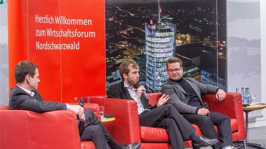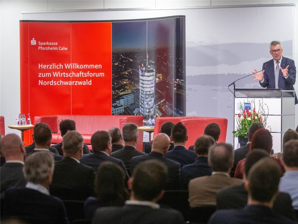 Stephan Scholl, Chef der Sparkasse Pforzheim Calw, sieht trotz aller KI-Aktivitäten gute Chancen für menschliches Leistungsvermögen. Aus- und Weiterbildung seien die Garantie für künftige Beschäftigung. Moderiert wurde die Veranstaltung von Uwe Bettendorf.