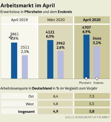 Pforzheim. Das Coronavirus hat den Arbeitsmarkt im Nordschwarzwald mit voller Wucht getroffen. Die Zahl der Arbeitslosen im Bezirk der Agentur für Arbeit Nagold-Pforzheim ist von März auf April um 1972 oder 16,3 Prozent auf 14 046 gestiegen, heißt es in einer Pressemitteilung. Zum Vergleich: Während der Finanzkrise im Jahr 2009 ist die Arbeitslosigkeit von März auf April nur um 811 gestiegen.
