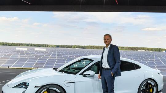 Oliver Blume, Vorstandsvorsitzender der Porsche AG, steht auf der Weltpremiere des Porsche Taycan in einer Halle vor einem Fotovoltaikkraftwerk auf dem Flugplatz in Neuhardenberg. Gestern feiert das erste reine Elektromodell aus Stuttgart-Zuffenhausen zeitgleich auf drei Kontinenten Weltpremiere.