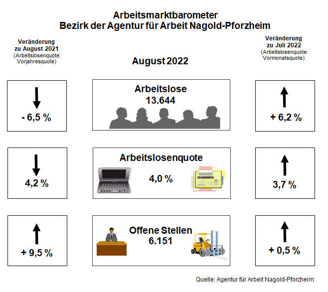 Pforzheim/Kreis Calw/Enzkreis. Wie in der Ferienzeit üblich ist die Arbeitslosigkeit im Nordschwarzwald von Juli auf August gestiegen. 13.644 Menschen waren im August ohne Arbeit, 800 oder 6,2 Prozent mehr als im Juli. Trotz des Anstiegs liegen die Arbeitslosenzahlen weiter deutlich unter dem Vorjahreswert. Im August 2021 waren noch 948 oder 6,5 Prozent mehr Männer und Frauen arbeitslos.