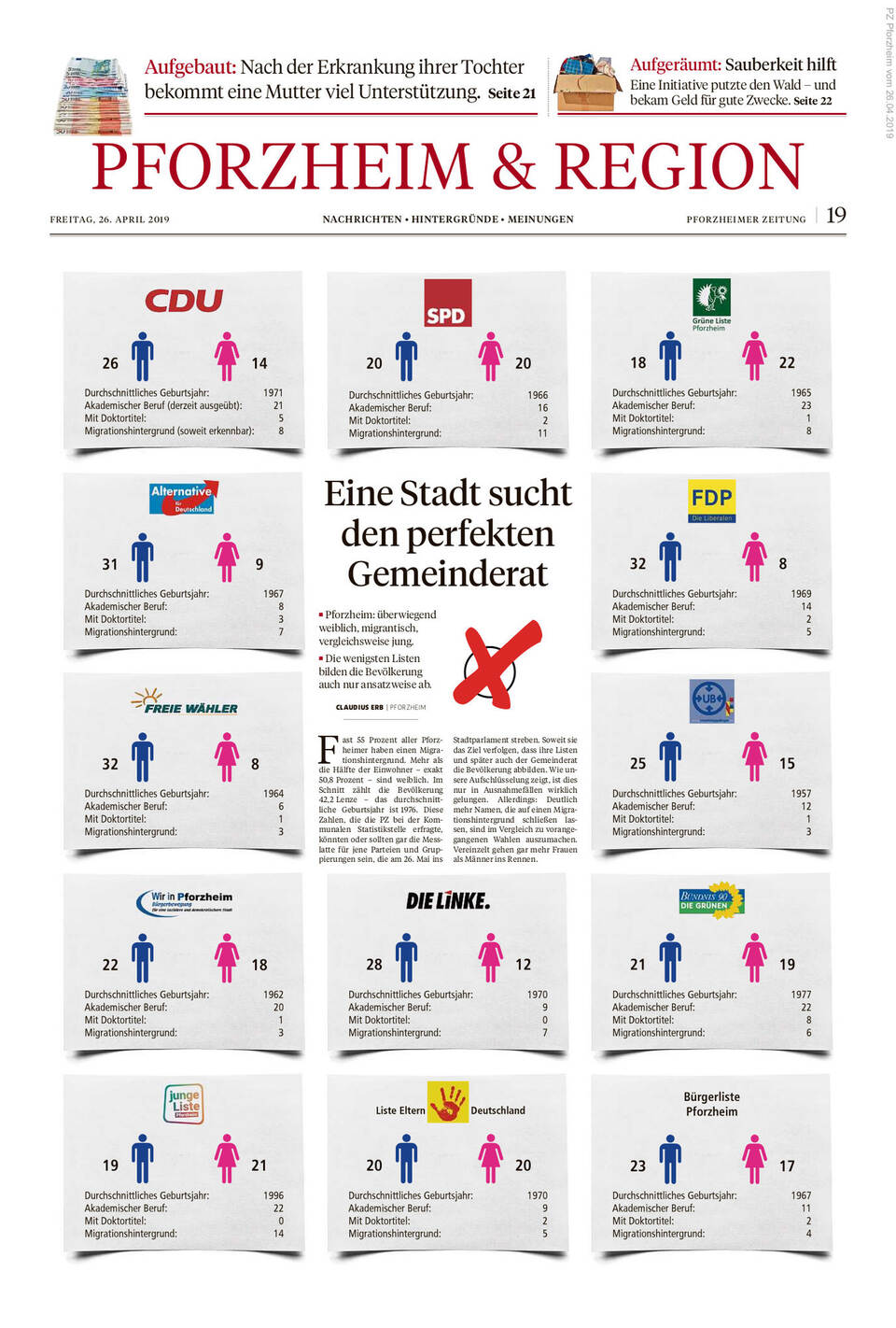 Auch die Lokalseite vom 26. April ist für den Zeitungsdesigner ein herausragendes Beispiel für den Trend in der Zeitungsbranche, komplexe Sachverhalte grafisch und mit kleinen Tabellen aufzubereiten. „Früher hätte man einen langen Text geschrieben und ein Foto dazu gestellt“. Die PZ zeige, wie man es richtig macht, um dem Leser darzustellen, ob die Kandidaten für den Pforzheimer Gemeinderat die Bevölkerung tatsächlich repräsentieren.